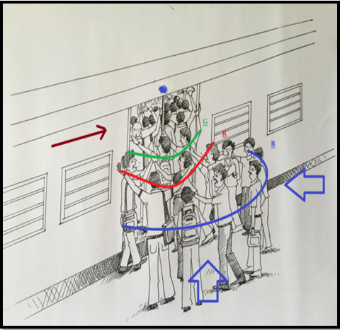 - Green Zone – The commuters who fall into the Green Zone are safe from accidents. Even though the train is extremely overcrowded, this category of public is completely inside the train, with their centre of gravity inside and with overhead handles to grab on to.